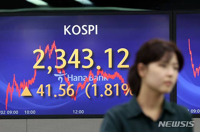 코스피가 전 거래일(2301.56)보다 41.56포인트(1.81%) 오른 2343.12에 장을 마친 2일 서울 중구 하나은행 딜링룸에서 딜러들이 업무를 보고 있다.
