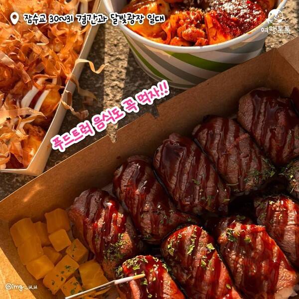 뚜벅뚜벅축제에서는 눈여겨볼 다양한 프로그램도 쏟아집니다. 잠수교 위를 산책하다가 출출해진 배를 채워 줄 수 있는 푸드트럭이 준비되어 있는데요. 푸드트럭에서 판매하는 음식은 걸으면서 간편하게 즐길 수 있는 음료와 분식 위주로 구성되어있습니다.