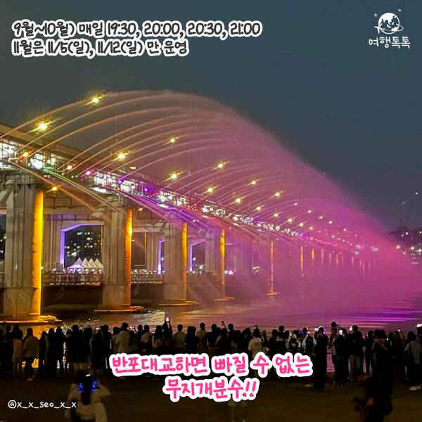 잠수교하면 빠질 수 없는 달빛무지개분수도 이번 가을 내내 만나보실 수 있습니다. 19:30, 20:00, 20:30, 21:00에 매회 20분씩 무지개 분수쇼가 이어지는데요.