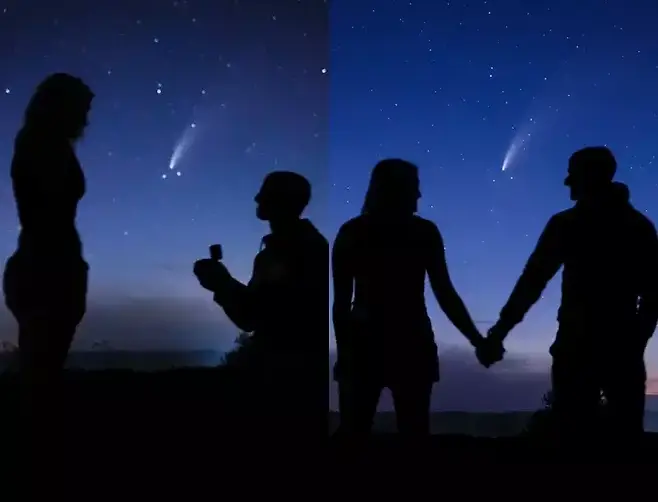 올해 주기가 약 6800년 정도로 알려진 네오와이즈 혜성이 찾아왔다. 한 번 기회를 놓치면 두 번 다시 이 혜성을 보기는 불가능한 상황. ‘인사이더’에 따르면 이러한 소식에 뉴욕에 사는 한 남성은 놀라운 생각을 한다. 프러포즈를 하기로 한 것이다. 평생 단 한 번뿐인 기회였기 때문이다. 연인과 네오와이즈 혜성이 떨어지는 상황을 지켜보던 이 남성은 한쪽 무릎을 꿇고 청혼했다.