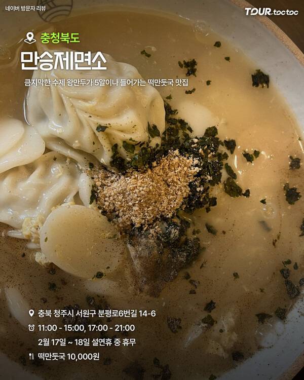 큼지막한 수제 왕만두가 무려 5개나 들어가는 ‘만승제면소’의 떡만둣국은 푸짐한 구성 덕분에 한 끼로도 넉넉한 포만감을 줍니다.