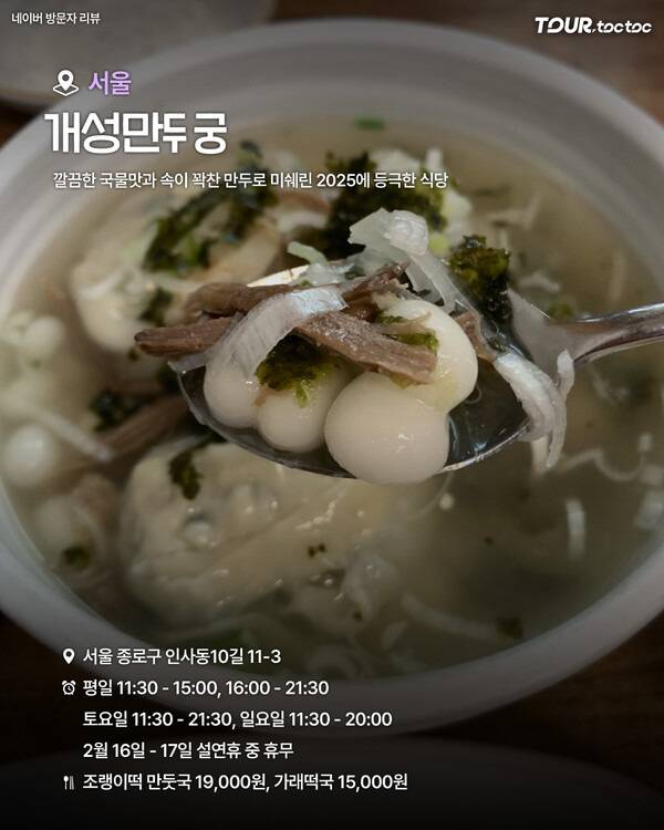 2025 미쉐린 가이드에 오른 ‘개성만두 궁’은 깔끔한 국물과 속이 꽉 찬 개성식 만두로 떡국의 깊이를 더합니다.
