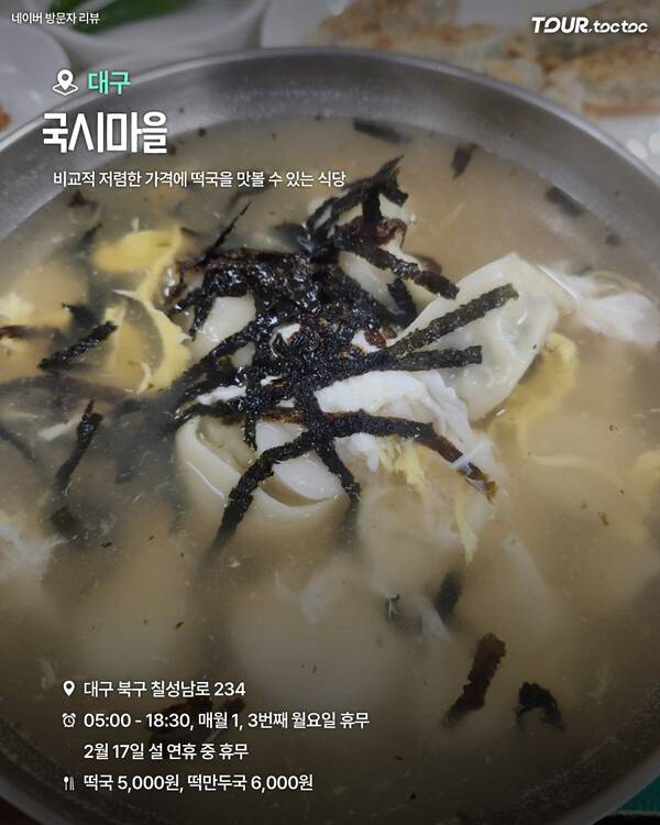 이른 새벽부터 문을 열기 때문에 아침식사로도 좋으며, 설날 가족 외식으로 부담 없이 찾기 좋은 대구 떡국 맛집입니다.