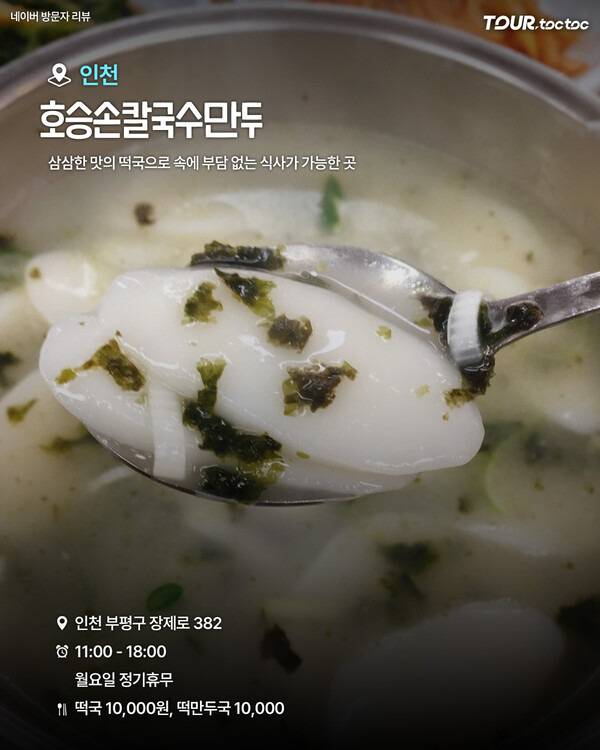 자극 없는 삼삼한 맛이 인상적인 인천 부평의 ‘호승손칼국수만두’. 속에 부담 없이 즐길 수 있는 떡국으로, 어르신들과 함께 가기에도 좋은 식당입니다.