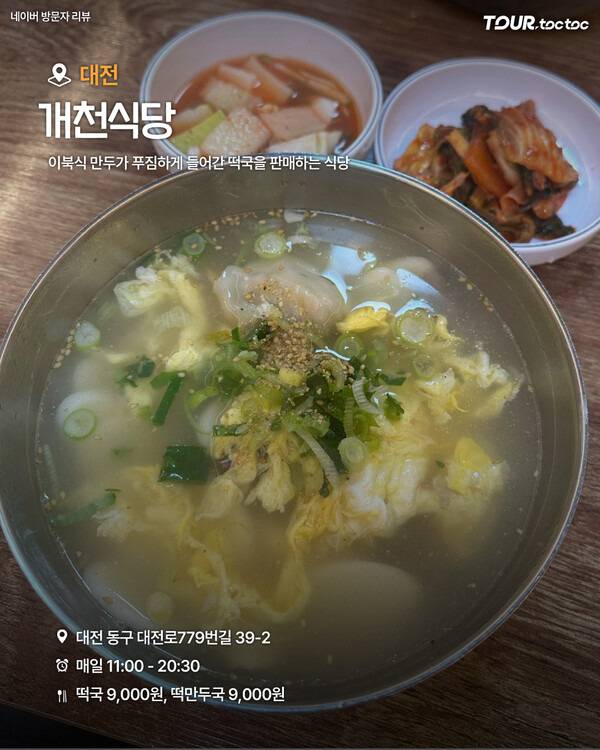 대전에 위치한 개천식당은 이북식 만두로 푸짐한 떡국을 선보입니다.