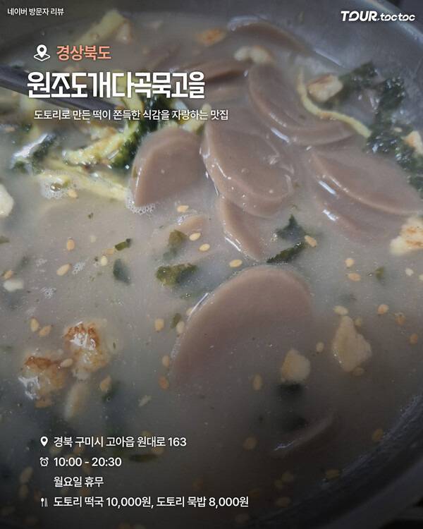 구수한 맛이 인상적이며, 묵밥 등 도토리 관련 메뉴도 다양하게 준비되어 있습니다. 이곳만의 특색 있는 떡국이 궁금하다면 꼭 한 번 방문해보길 추천드리는 구미 맛집입니다.