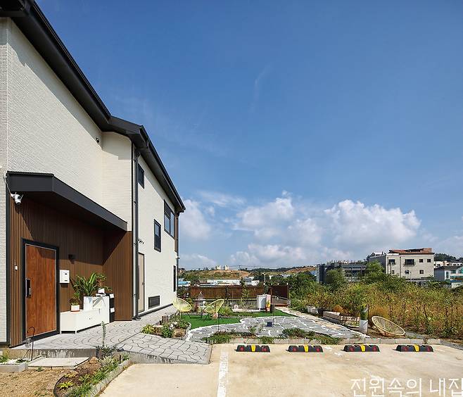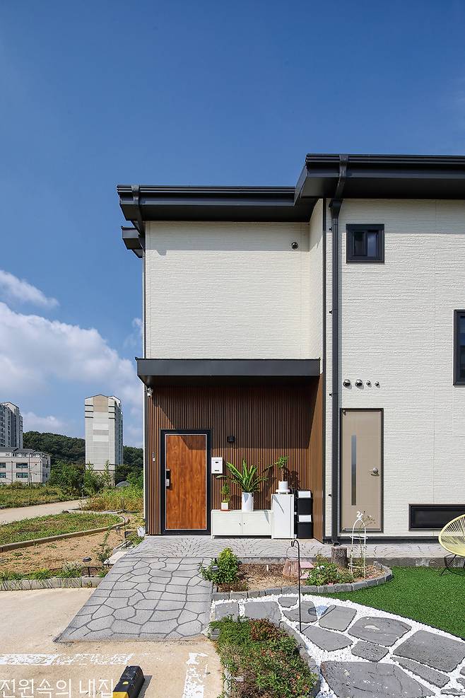 주택은 요철이 많지 않고 반듯해 단정한 우유팩을 연상케 하고, 마감재는 오염에 강하다는 세라믹사이딩을 둘렀다. 그러면서도 부분적으로 짙은 우드 톤의 템버보드를 얹어 집은 단조롭지 않고 표정이 생겼다. 건축 골조 목수로 활동하는 용진 씨는 “화려한 디자인보다는 방수와 단열 등 하자를 최소화하는 것에 중점을 두었다”고 전했다.