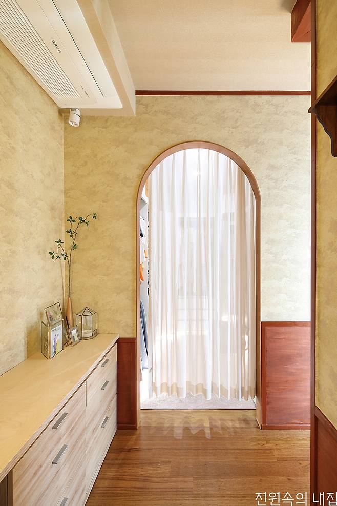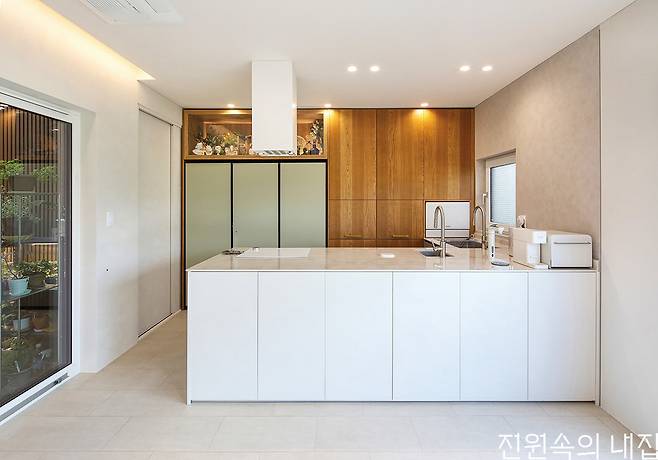 중정 옆으로는 주방이 자리한다. 주방은 보조주방과의 역할을 분담해 콤팩트하게 갖췄고, 거실을 마주 보게끔 싱크대가 놓였다. 한편 하부장은 밝은 그레이 톤이지만, 제품 본래의 컬러가 아니다. 벽과의 컬러 매치가 아쉬웠던 미정 씨가 직접 인테리어 필름을 자르고 붙이며 마감한 것이다. 이를 위해 그녀는 필름 관련 자격증을 따기도 했다.