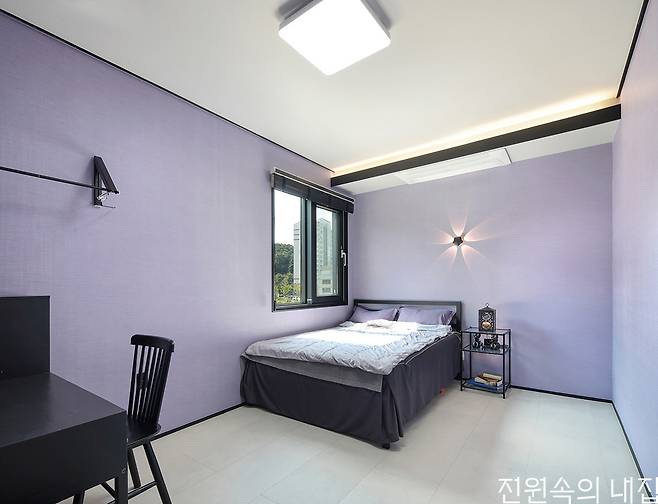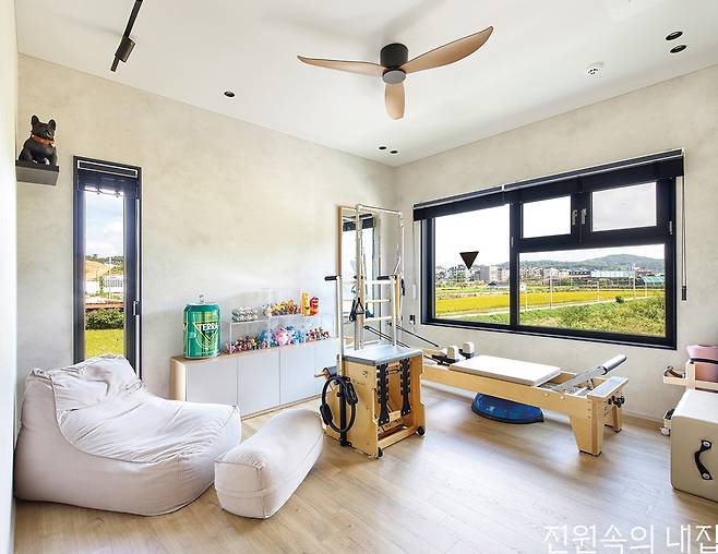 2층으로 들어서면 안방과 욕실, 운동실로 쓰는 거실, 세탁실 등 부부의 프라이빗한 공간들이 배치되었다. 방은 각각 다른 컬러로 인테리어가 이뤄졌는데, 한 공간에서 다양한 경험을 즐기기 바랐던 미정 씨의 바람에서 비롯한 콘셉트다. 안방에서 가장 먼 곳에는 세탁실이 자리했다. 편안한 숙면으로부터 소음원을 멀리 떨어뜨리면서도 층을 오가는 번거로움을 피하기 위한 배치다. 세탁실 또한 다른 실과 다르게 마감재가 유럽식 미장 마감이다. 이 또한 미정 씨가 손수 챙긴 작업이다.