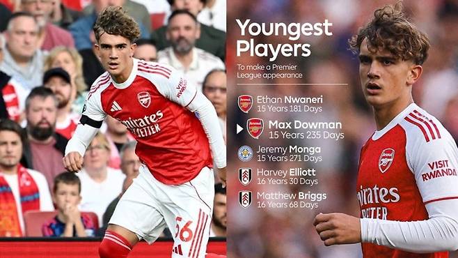 아스날 리즈전에서 한가지 더 눈에 띈 점은 2009년 12월 31일생인 15세 235일 나이에 프리미어리그 데뷔전을 치른 아스날 유스 출신 맥스 다우먼이다. 맥스 다우먼은 에단 은와네리의 15세 181일 PL 최연소 데뷔에 이어 2번째로 어린 나이에 PL 데뷔를 한 선수로 기록됐고, 이날 우측 측면에서 번뜩이는 움직임을 보이며 페널티킥을 얻어내는 등 인상적인 활약을 펼쳤다.