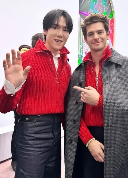 같은 스타일을 소화한 또 다른 스타가 있었어요. 바로 스파이더맨 시리즈로 유명한 배우 앤드류 가필드였는데요. 그는 같은 스웨터 위에 롱코트를 걸쳐 좀 더 포멀하고 도시적인 무드로 스타일을 연출했습니다.