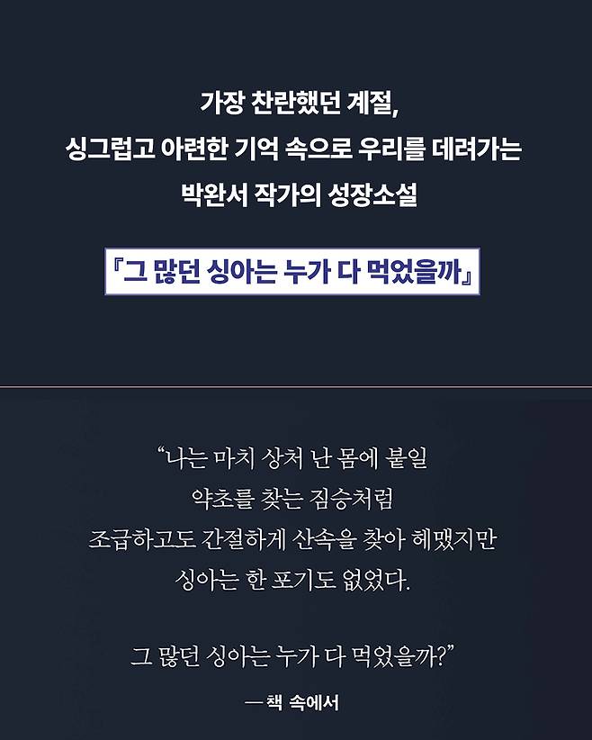 그 찬란한 생명력과 환희, 비애, 서글픔에 이끌려 싱아를 간절히 찾아 헤매는 소설 속 화자가 되어 있는 자신을 발견하게 됩니다.