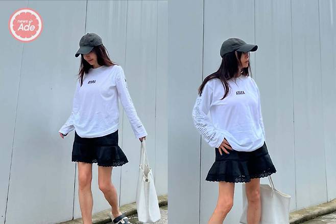 그녀는 자신의 인스타그램에 하얀색 긴팔 티셔츠와 검은색 미니스커트를 입고 각선미를 드러냈습니다.