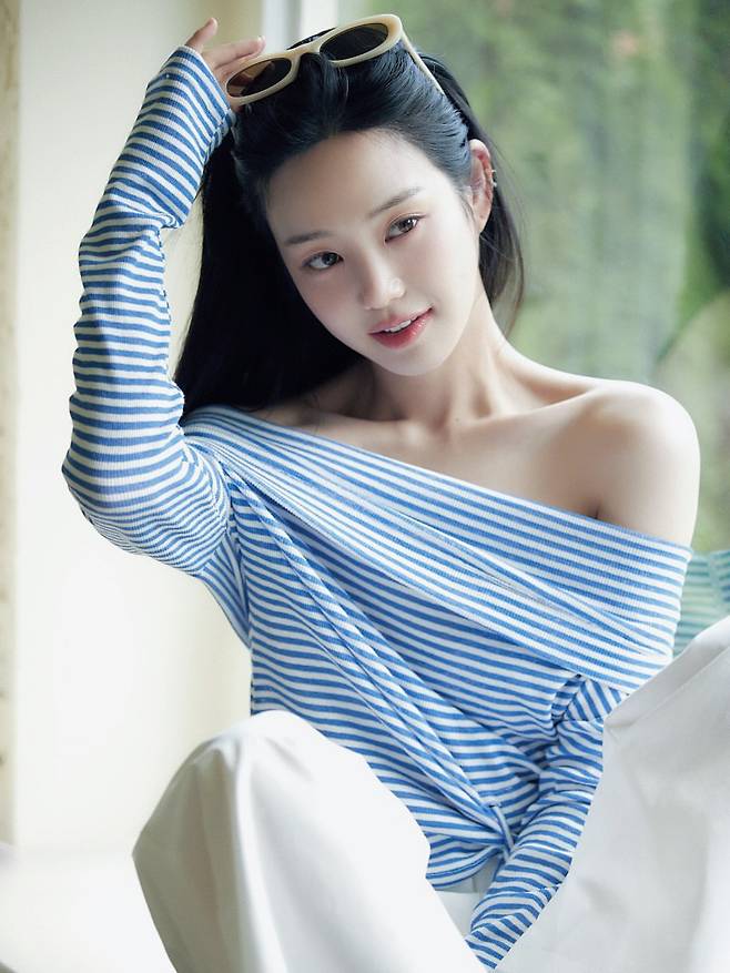 마지막 사진에서는 블루 앤 화이트 스트라이프 오프숄더 탑으로 마린 룩의 정수를 보여주고 있다. 아이보리 선글라스를 헤어밴드처럼 활용한 센스 있는 스타일링이 돋보이며, 한쪽 어깨를 드러낸 오프숄더 디자인으로 여성스러우면서도 캐주얼한 매력을 동시에 표현하고 있다.