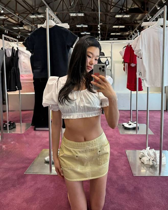 배경으로 보이는 의류 쇼룸과 팝업 행사장의 분위기 역시 그녀의 스타일링과 완벽한 조화를 이룬다. 베이지 톤의 벽과 어우러지는 골드 스커트, 차분한 조명 아래 더욱 부각되는 화이트 셔츠의 청량감이 더해지면서 하나의 연출된 화보 같은 느낌을 준다.