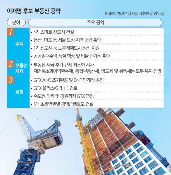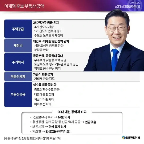 실제 정부는 “부동산 공급으로 가격 안정화”를 강조하며, 25만호 공공주택, 3기 신도시 및 도심 개발, 도시정비사업(재건축·리모델링 등) 규제 완화와 신속 추진을 약속했다.