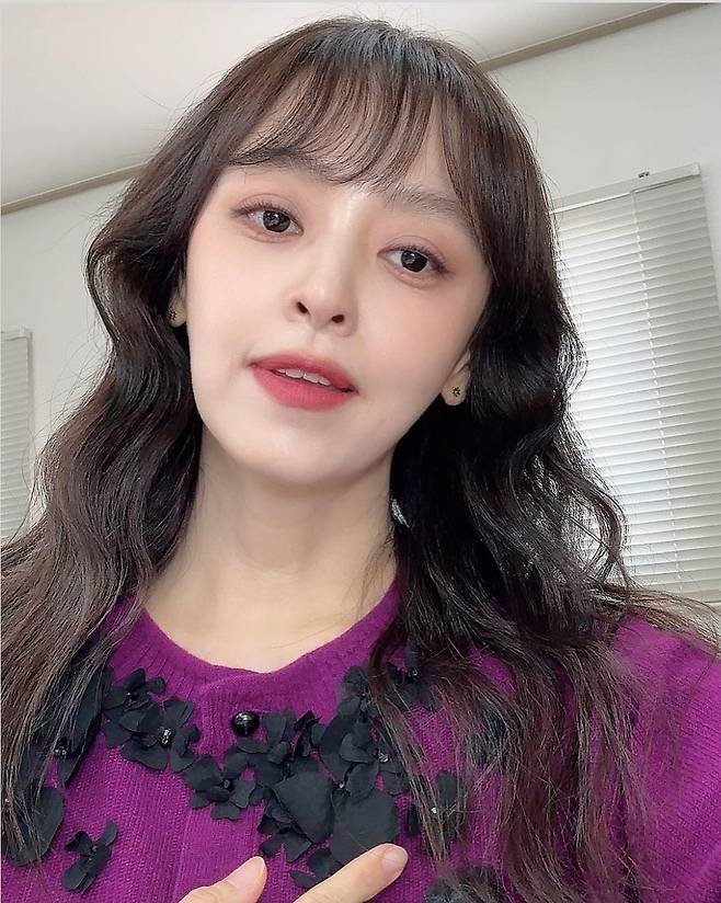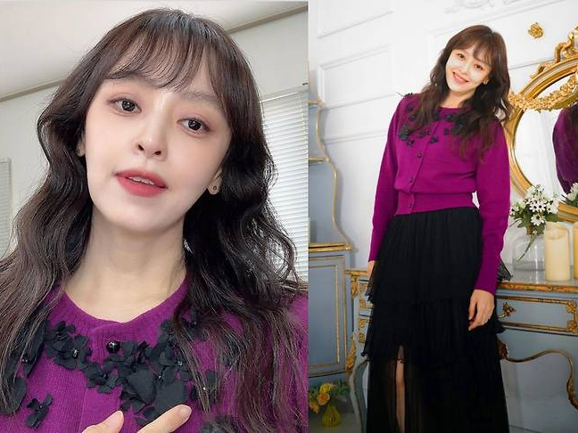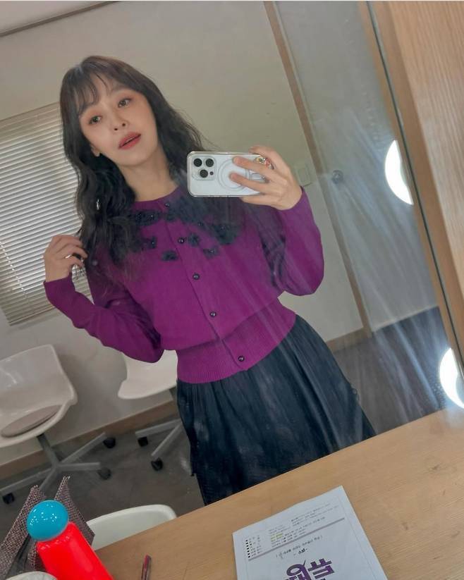 강성연은 과감한 퍼플 컬러의 니트 카디건을 착용해 고급스러운 분위기를 강조했습니다.