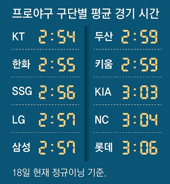 ‘마의 3시간’을 깨기 위한 한국 야구계의 오랜 숙원이 어쩌면 올해 현실이 될 것으로 보인다. 18일 현재 정규시즌 720경기 중 절반가량인 355경기를 치른 가운데 평균 경기 시간은 2시간 59분(정규 이닝 기준)을 기록 중이다. 2010년 집계 후 처음 평균 3시간 벽을 허물었다. 지난해 3시간 10분을 앞지른 것은 물론이고 2014년과 비교하면 25분이나 경기 시간이 단축됐다. 2009년까지는 연장을 포함한 평균 경기 시간을 따졌는데 이렇게 계산해도 올해는 3시간 2분으로 1998년(2시간 59분) 이후 27년 만에 가장 경기 속도가 빠르다.