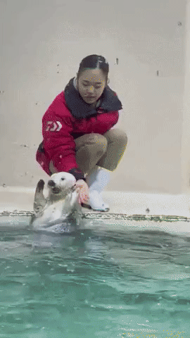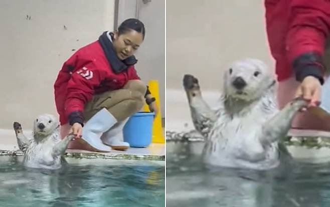 해달은 그저 사육사의 손을 놓치 않았을 뿐인데요. 그렇게 해달은 동상이라도 되는 듯 옆으로 자리를 이동했는데요.