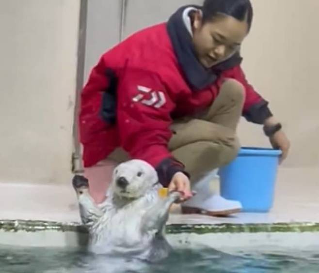 이날 해달은 무슨 영문인지 사육사가 손을 잡고 옆으로 이동하자 진짜 고장이라도 난 것 마냥 몸을 움직이지 않았습니다.