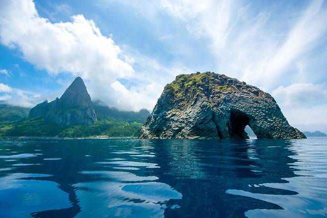 울릉도의 코끼리바위는 천연기념물처럼 보일 정도로 독특한 형태를 가진 기암절벽으로, 마치 거대한 코끼리가 바다에 코를 담근 모습처럼 보입니다. 절벽 뒤로는 울릉도의 푸른 산세가 솟아올라 있고, 바다 위에는 빛이 은은하게 반사되며 조용한 장면을 만들어내는데요.