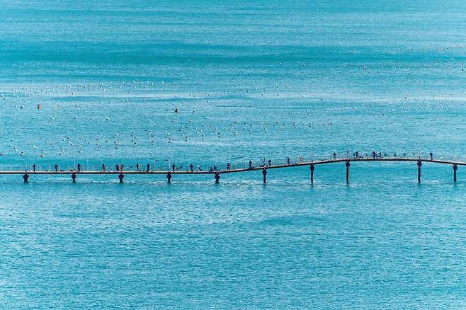 통영의 등대낚시터는 이름만 들으면 낚시터처럼 보이지만, 실제로는 바다 한가운데를 가로지르는 압도적인 스케일의 산책로가 펼쳐지는 곳입니다. 잔잔한 바다 위로 길게 이어지는 데크는 마치 거대한 호수 위를 걷는 듯한 착각을 줍니다.