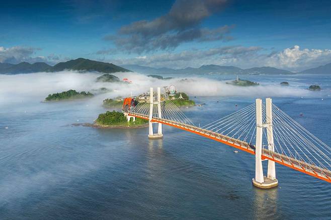 삼천포대교는 사천 앞바다를 잇는 다리이지만, 운이 좋으면 사진 속처럼 바다 위를 흐르는 해무가 대교를 감싸며 마치 구름 위에 떠 있는 듯한 신비로운 풍경을 만들어냅니다. 붉은 아치와 케이블 구조가 어우러진 이 대교는 스케일과 디자인이 모두 뛰어나, 드라이브 코스로도 손꼽히는 곳입니다.