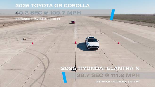 첫 테스트에서 GR 코롤라는 AWD 시스템 덕분에 빠르게 출발했으나, 곧 엘란트라 N이 추월하며 400m 지점에서 앞섰고, 이후 U턴 구간을 포함한 전 구간에서도 우위를 유지했다. 운전자를 바꾼 두 번째 시도에서도 결과는 동일했다. 두 차량 모두 최선을 다했지만, 엘란트라 N이 사실상 완승을 거뒀다.