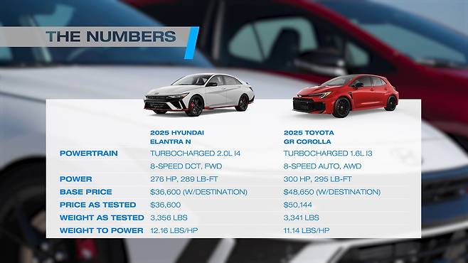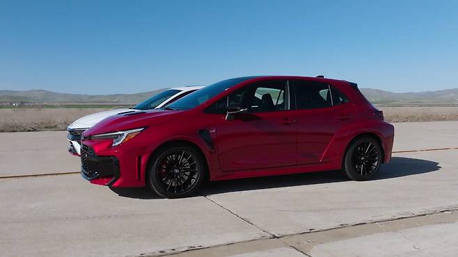 이에 맞선 GR 코롤라는 1.6리터 직렬 3기통 터보 엔진으로 300마력, 40.8㎏·m의 토크를 낸다. 8단 자동변속기와 사륜구동 시스템을 갖췄으며, 공차중량은 1,515㎏로 엘란트라보다 약간 가볍다. 하지만 가격은 7,150만 원이 넘는다.