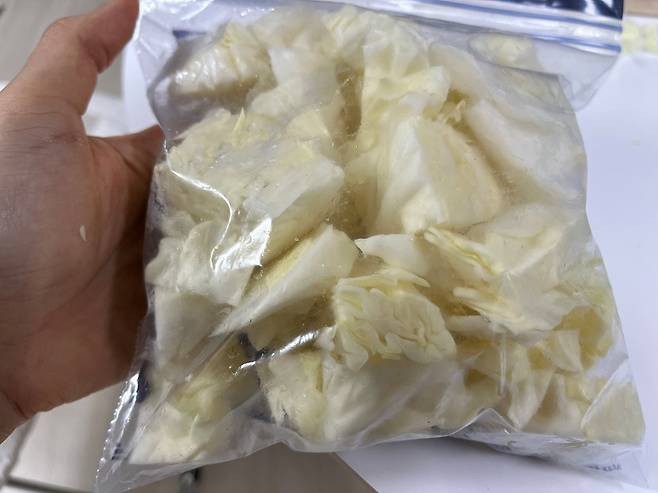 썰어서 손질한 양배추는 세척하지 마시고 바로 지퍼백에 담아 보관하세요. 세척은 먹을 때 해도 충분합니다.