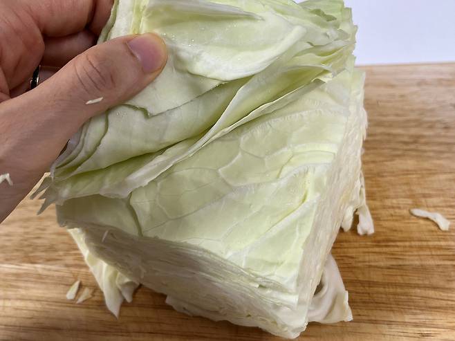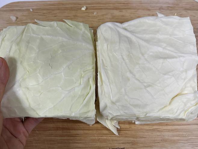 이렇게 귀퉁이 4군데를 모두 잘라내면 심지를 중심으로 가운데 사각형 모양으로 남게 되는데요. 이 부분은 양배추 쌈에 적합한 부위입니다.