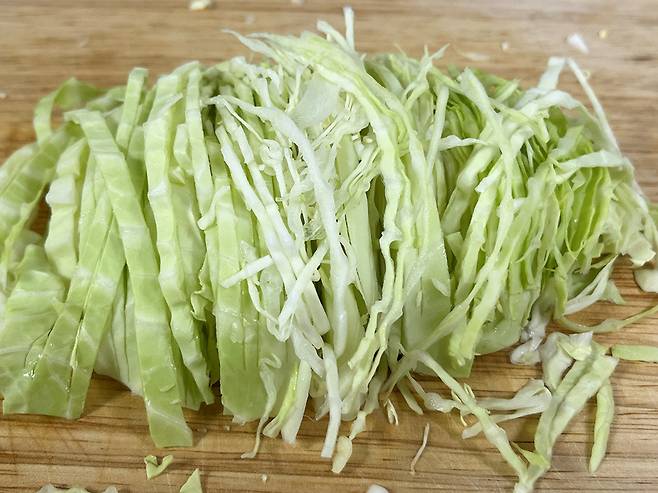 가늘게 채를 썰어 놓으면 볶음 요리, 샌드위치 또는 샐러드 등에 활용할 수 있습니다. 필요에 따라 적당한 두께로 채를 썰어 놓으세요.