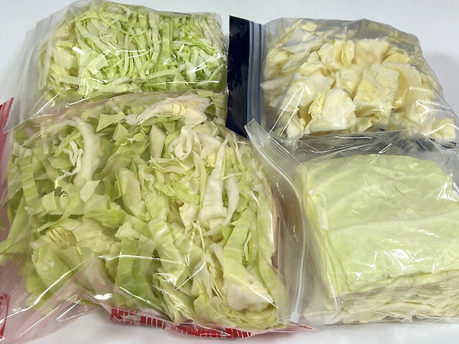 채 썬 것도 지퍼백에 담아 보관합니다. 용도에 따라 다양하게 손질하여 보관하면 바로 꺼내 쓸 수 있어 편리합니다. 양배추, 그냥 보관하지 마시고 이렇게 손질해서 보관하세요!