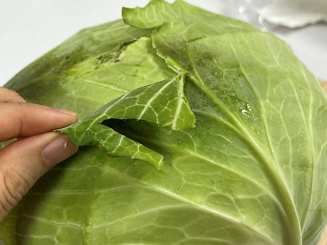 먼저 양배추 겉에 붙은 지저분한 잎들을 정리합니다. 운송 과정에서 시들거나 찢긴 잎들은 과감 없이 떼 주세요.