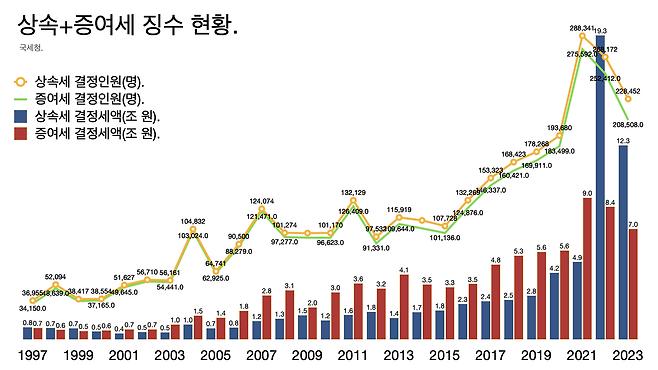 - 상속세 과세 대상과 세액은 이미 윤석열 정부 들어 크게 줄어든 상태다. 2022년 19.3조 원에서 2023년 12.3조 원으로 줄었다. 증여세도 8.4조 원에서 7.0조 원으로 줄었다. 부동산 가격 하락 여파다.