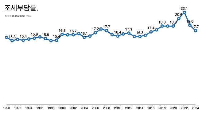 - 2022년 22.1%를 찍고 지난해에는 17.7%까지 줄었다. 대규모 감세가 세수 기반을 흔들고 있다는 지적이 나온다.