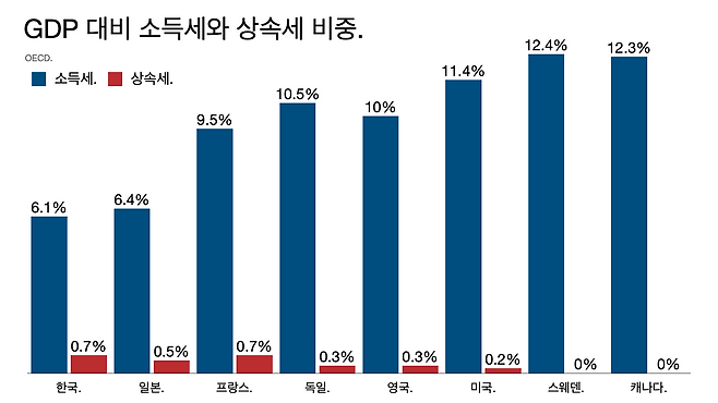 - 2021년 기준으로 한국은 GDP 대비 소득세 비중이 6.1%, 상속세 비중이 0.7%다. 일본(6.4%, 0.5%)과 프랑스(9.5%, 0.7%)가 소득세 비중이 낮은 나라고 독일(10.5%, 0.3%)과 영국(10%, 0.3%), 미국(11.4%, 0.2%)은 상속세보다 소득세에 무게를 둔 나라다.