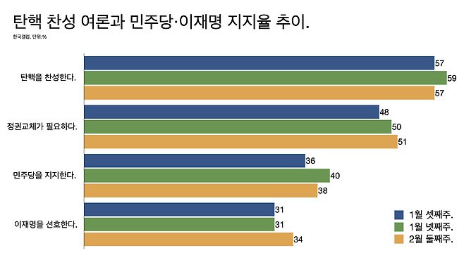 - 이재명은 여전히 압도적이지만 50%를 장담할 수 있는 상황은 아니다. 정권 교체가 필요하다는 여론은 51%인데 이재명 선호도는 34%에 그쳤고 절대 지지하지 않겠다는 답변은 41%나 됐다.