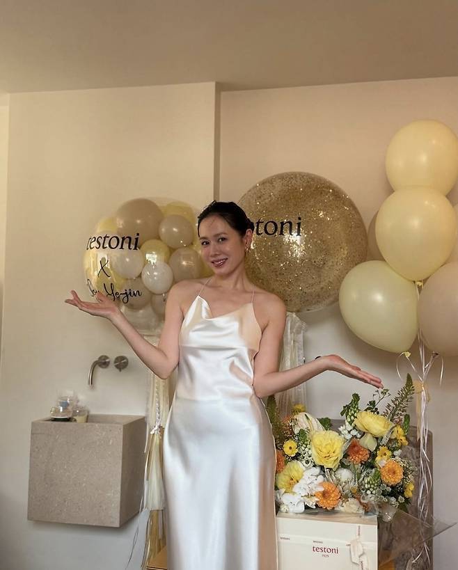 깔끔하게 올린 헤어스타일과 화사한 미소로 등장한 손예진은 광택감 있는 새틴 화이트 드레스를 입고 우아한 실루엣을 자랑했습니다.