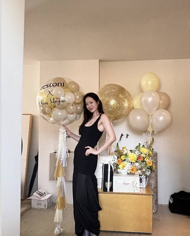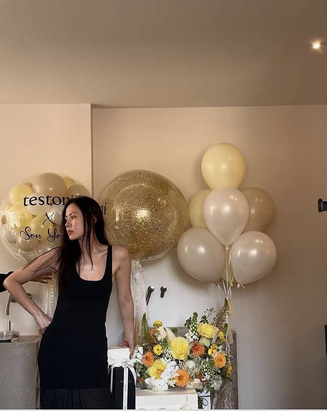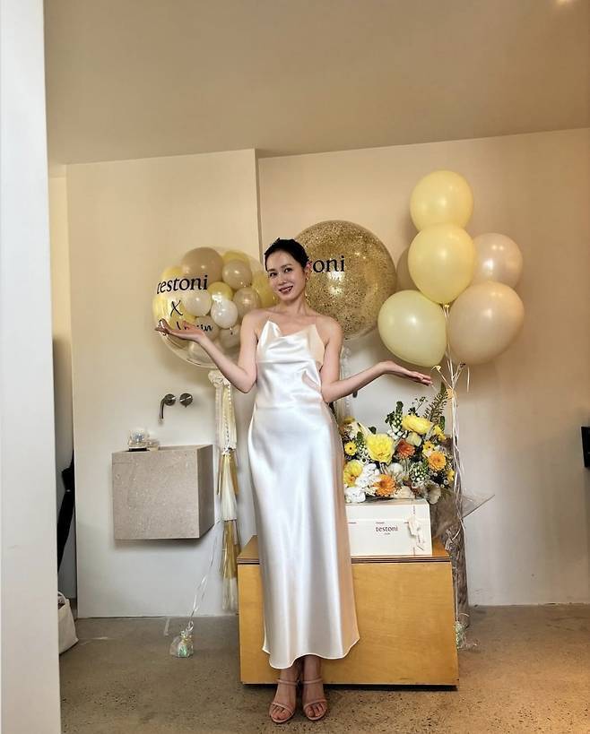 허리 라인을 자연스럽게 드러내며 미니멀하면서도 고급스러운 무드를 극대화했고, 옐로 톤의 플라워 장식과 풍선이 어우러져 화보 같은 장면을 완성했습니다.