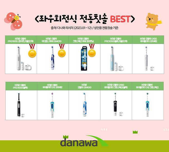가장 높은 점유율을 차지한 상품은 브라운 오랄비 PRO2500 (핑크)로 나타났다. 판매량 점유율은 21.34%다. 전원 방식은 충전식이고, 회전수는 분당 9,900회다. 일반, 부드러운, 화이트닝 모드를 구비하고 있어 상황에 따라 모드를 바꿔 사용할 수 있다. 진동수는 45,000회다. 압력센서를 탑재하고 있다. 충전은 12시간이 소요되고, 1회 충전으로 14일까지 쓸 수 있다.