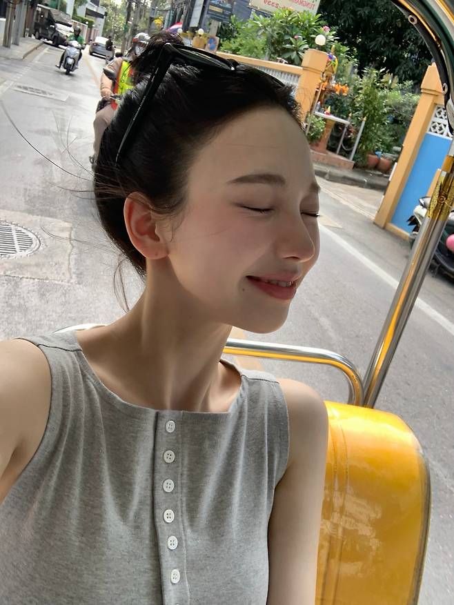 카리나가 보여준 이번 스타일은 여행지의 자유로운 분위기와 본인의 맑은 이미지를 잘 결합한 세련된 슬리브리스룩이에요.