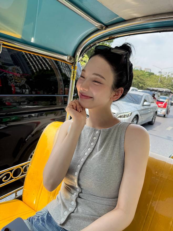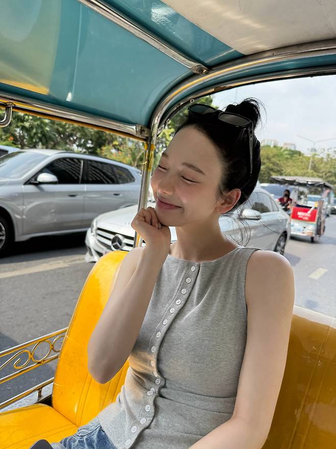 차분한 그레이 컬러의 민소매 상의를 선택해서 시각적인 시원함을 주는 동시에 지적인 무드까지 놓치지 않았네요.
