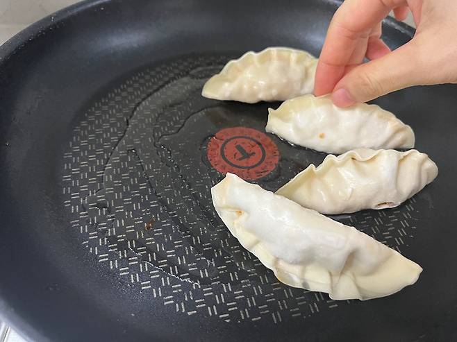 팬에 기름을 넉넉히 붓고 냉동 만두를 올려 주세요. 팬은 열전도 때문에 작은 것 말고 큰 것을 사용해 주세요.