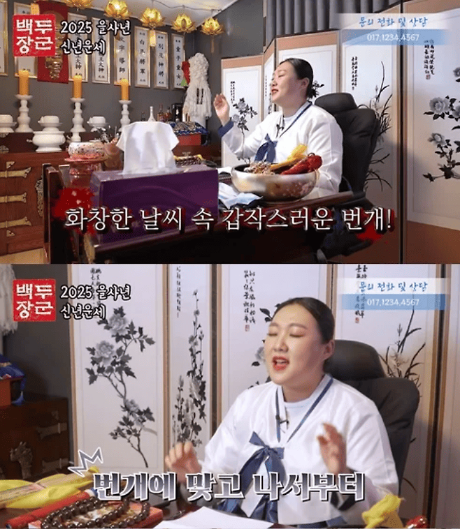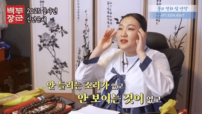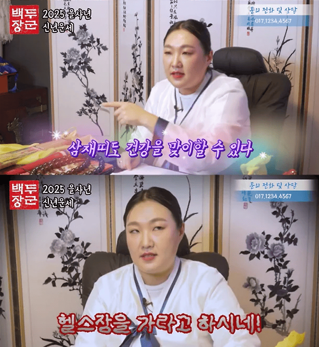 특히, 금전운과 건강운을 강조하며 “건강하려면 야채를 많이 먹고 운동을 꼭 해야 한다”고 반복해 말하며 마치 실제 무속인이 점괘를 풀이하는 듯한 디테일을 보여줬습니다.