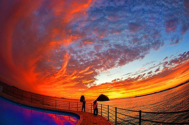 겨울철 석양은 이 두 바위 사이로 떨어지며 마치 자연이 만든 거대한 캔버스 위에 붉은 태양이 서서히 사라지는 듯한 장관을 연출합니다.