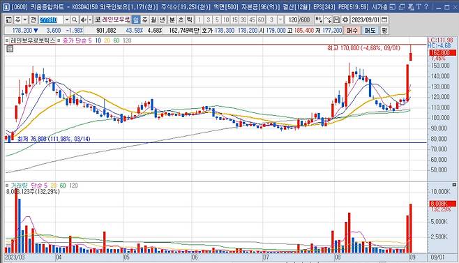 2023년 8월 31일은 로봇 테마주가 시장을 주도했는데 그중에서도 레인보우로 보틱스가 상한가로 마감하여 가장 상승률이 높았으며 대장주라고 볼 수 있습니다.