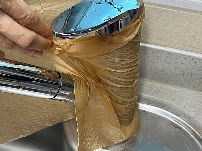 식초 희석한 물에 적신 키친타월은 주방 싱크대 수전, 물때 낀 틈새, 스테인리스 손잡이 등에 꼭꼭 감싸듯 싸매어 붙이세요. 이렇게 하면 식초의 산 성분이 물 때와 묵은 얼룩을 부드럽게 녹여내고, 키친타월이 표면에 밀착되어 효과적으로 오염을 분해합니다.