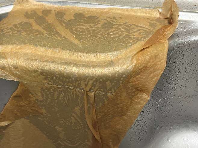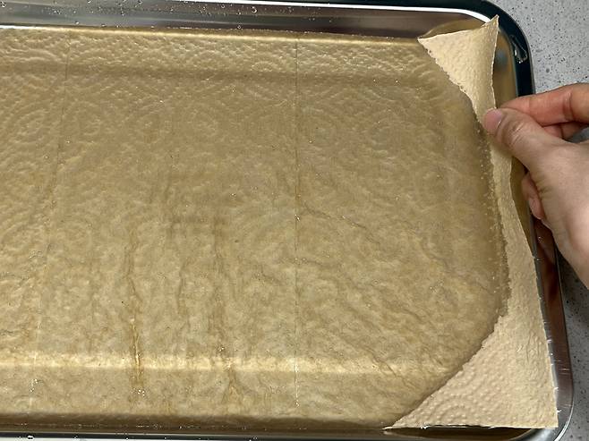 식초를 희석한 물에 키친타월 2~3칸을 뜯어서 적십니다. 물과 식초 비율 약 10:1 정도로 맞춰 주세요.