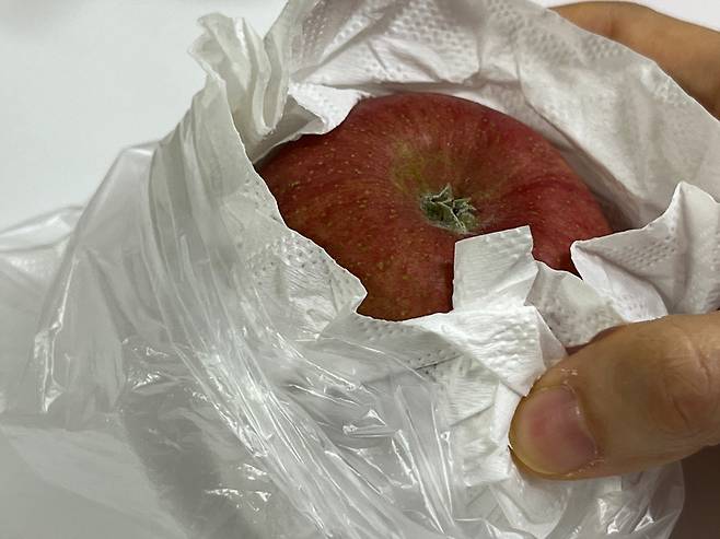 키친타월에 감싼 사과는 비닐봉지에 넣어 외부 공기 유입을 차단합니다. 비닐봉지에 넣을 때 입구를 너무 꽉 묶지 마시고 살짝 여유 있게 묶어 공기가 어느 정도 통하도록 해주세요.